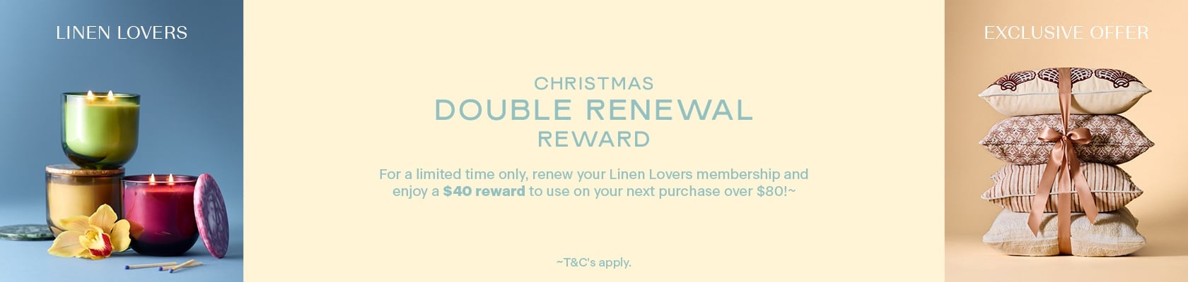 The Christmas Double Renewal Reward offer is exclusive to expired Linen Lovers Program members who have renewed their membership for $19.95 during the offer period (19/11/2025 – 23:59 AEDT 17/12/2025), either online or in-store and to current members with no more than 6 months remaining on their membership. The offer includes a $40 Renewal Reward with a minimum spend of $80 at adairs.com.au or any Adairs, Adairs Kids or Adairs Outlet stores. The Renewal Reward will be sent via email within 48 hours after renewing and is valid for 30 days from the date of issue. Offer available in Australia only.